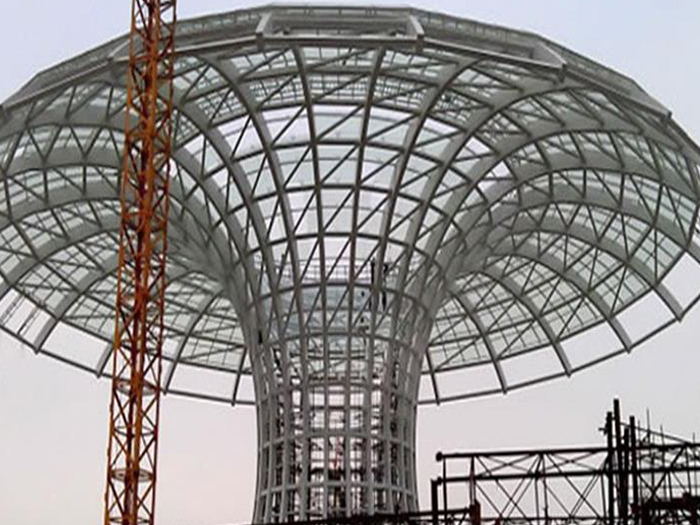 二、球形网架结构因其结构新颖,受力合理,自重轻、用钢量低等优点。如大型体育场馆球形辽源螺栓球网架、公共场馆球形网架、电厂辽源螺栓球网架、水泥工业球形网架、仓储物流球形网架、辽源干煤棚工业球形网架、辽源收费站辽源加油站球形网架、展览中心、影剧院、商场、航站楼、候车厅、工厂辽源车间、仓库、电视塔等球形螺栓球节点网架。国内球形网架结构主要分为:辽源焊接球节点网架及螺栓球节点网架两种。螺栓球节点网架其构件工厂内加工量较大,现场安装便捷,适用于现场工期紧,辽源施工条件、用电量受制约,网架形状复杂、辽源杆件定位困难的异形结构。螺栓球节点球形网架系统基本由辽源杆件、螺栓球、支撑支座等组成。按照节点形式可分为交叉辽源桁架体系、四角锥体系、三角锥体系等。支撑方式多为固定支座支撑。对于大面积、大跨度及有特殊受力或伸缩要求的网架结构可采用橡胶支座、滑移支座、球铰支座等支撑形式,以满足结构自身的受力稳定、均衡,便于内力释放等设计要求。